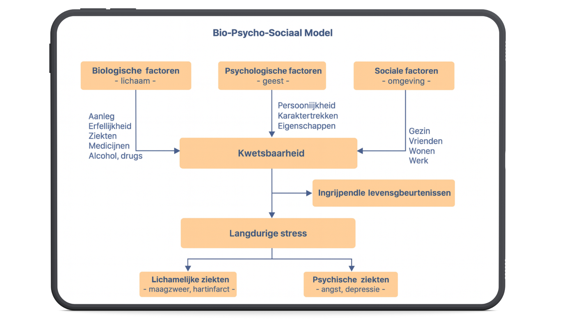 Het biopsychosociaal model helpt om die puzzel beter te lezen. Het laat zien dat lichamelijke klachten bijna nooit één duidelijk aanwijsbare oorzaak hebben, maar ontstaan door een samenspel van biologische, psychologische en sociale factoren. Die mix is voor iedereen anders.